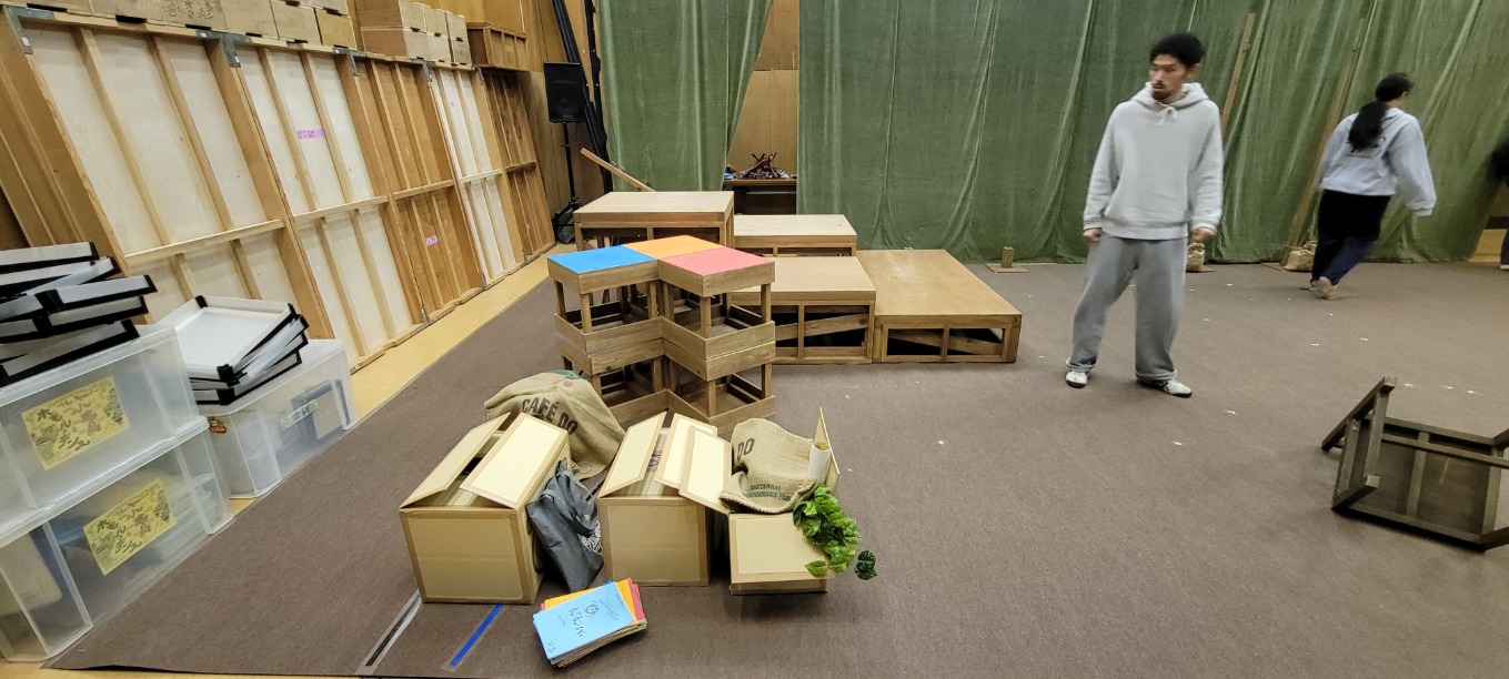 稽古場ではセットを組み立てて、実際の舞台と同じ大きさで練習をしています。