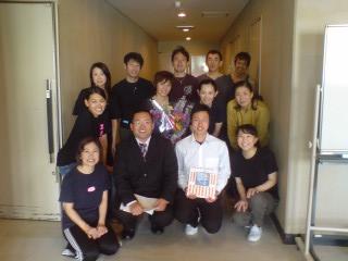 写真は、座談会終了後の記念撮影(たまたま通りかかった劇団員にも入ってもらった)とサポーターの皆さんへの記念品です。両公演名が入っているハンドタオルです。