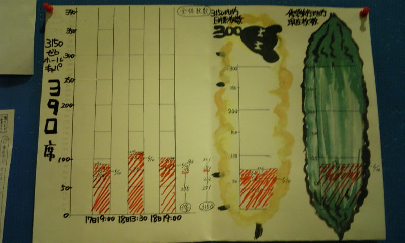 公演を成功させるためにも一人でも多くのお客さんに見てもらいたいと若手中心のプロジェクトチームを立ち上げ、チーフの岡山くんが毎日、チケットの売上状況をグラフに記入してくれています♪