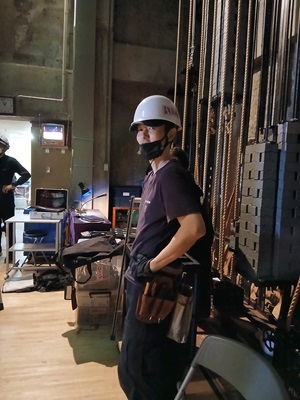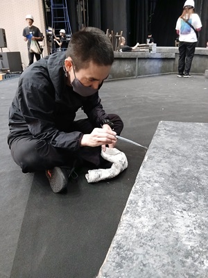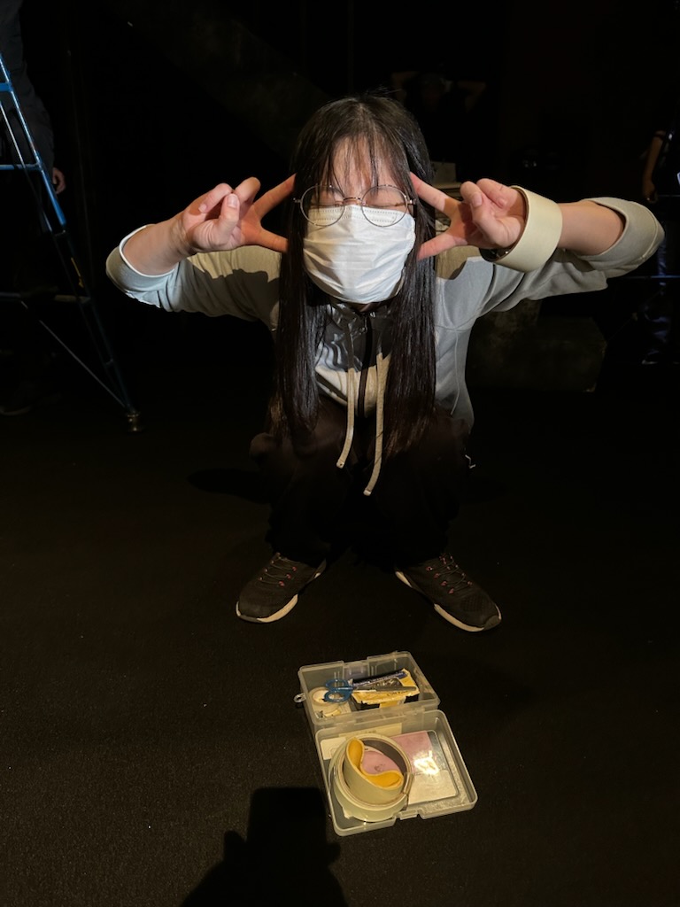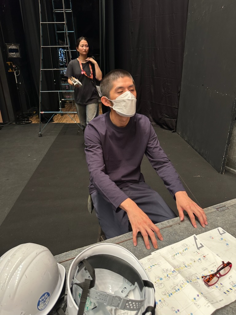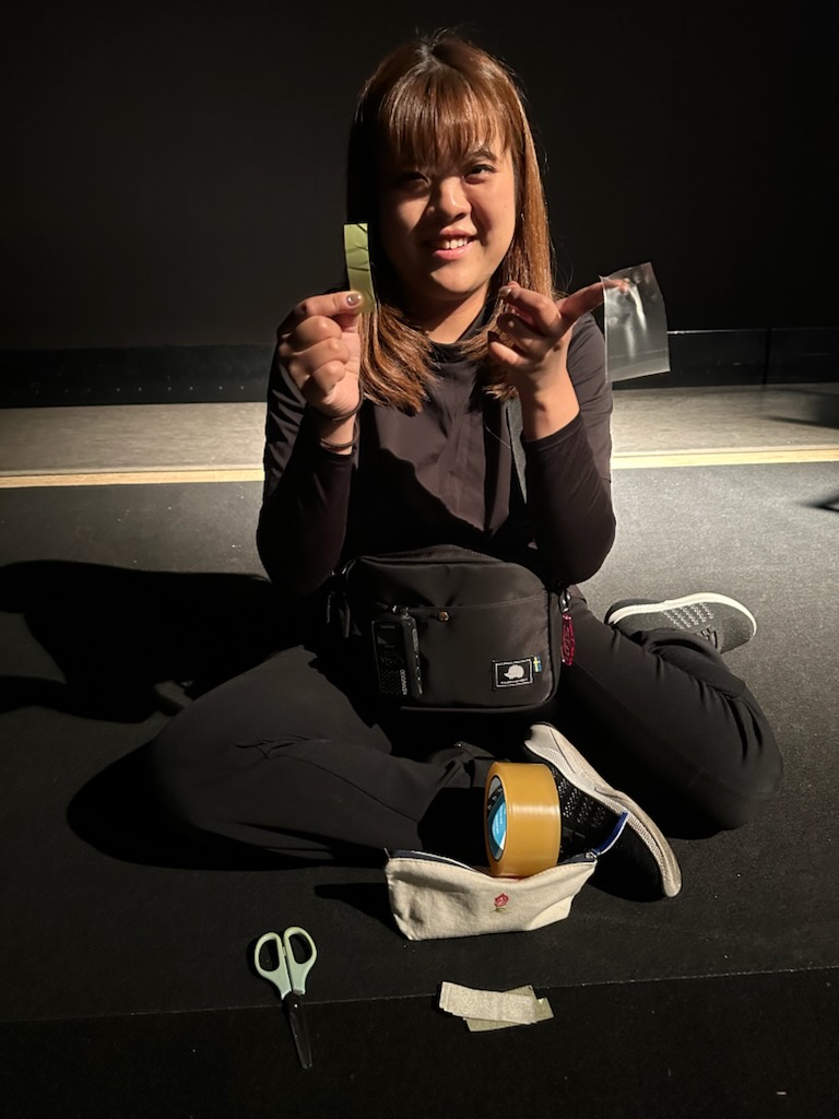 同じくバミリを貼り直してくれているのは今回はスタッフで来ていただいていますが女優の五嶋さんです。
