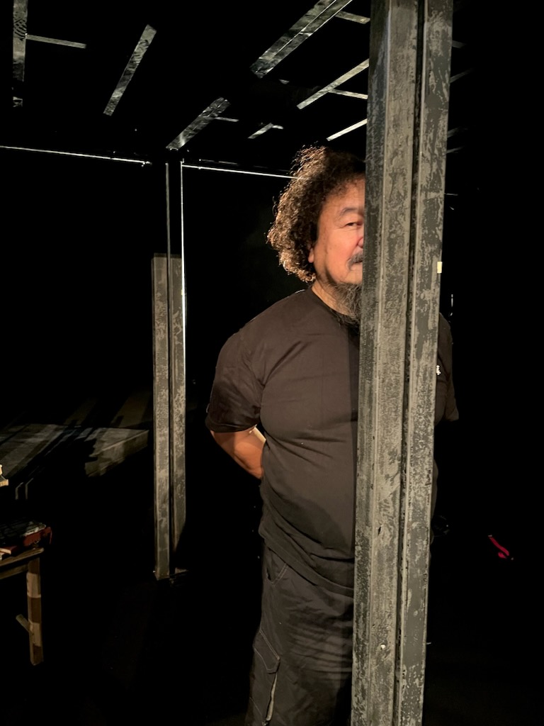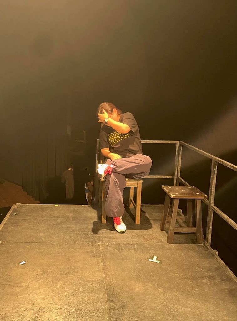 暗い中舞台上で何かしているのは囚人役の佐藤くんです。恐らく集中力を高めているのでしょう。