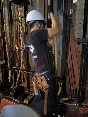 搬入をしている中、照明部は、照明を吊り込んでいます。