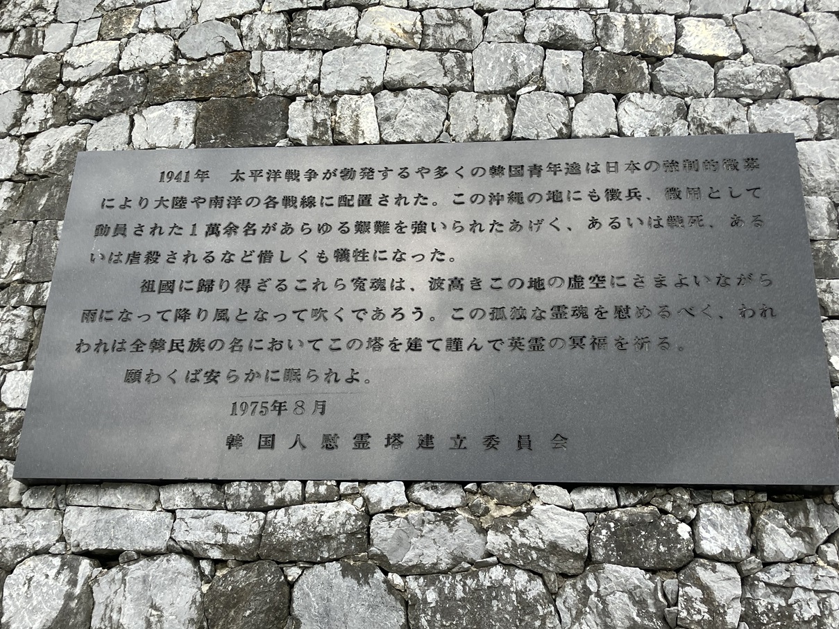 韓国人慰霊塔、平和記念館、平和の礎、そして美しい海岸線。「沖縄戦ではこの海岸線が多くの軍艦でうめ尽くされていた事を想像してみてください」と今回のツアーの企画兼、ガイド兼、通訳のキムウネさんの言葉に胸が痛くなります。
