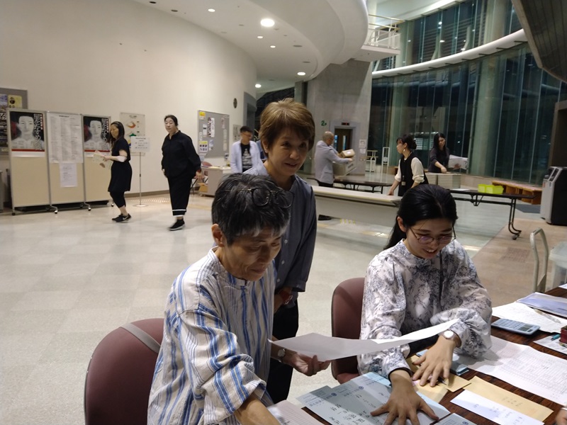 受付では、この沖縄での公演成功の為に本隊よりも早くから現地入りし、製作として奮闘くださった佐藤尚子、白木匡子、佐野菜々子(敬称略)の御三方がお客様の対応に大わらわ。そして本番。沢山のお客様の温かく大らかな反応のお陰もあり、カーテンコールも今旅初めてのトリプルコールをいただく忘れられない素敵な千秋楽になりました。皆様、ありがとうございました!そしてスタッフ・キャストの皆さん、お疲れ様でした!