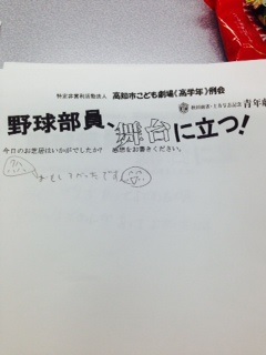 2013/10/23-2 ほいほ〜い☆座談会の様子をアユレポート!![]() 参加してくれたのは桑名高等学校演劇部の皆さん。 「二時間があっという間だった」「それぞれ個性の違うキャラクターで面白かった」「見せる場面転換が新鮮だった」などなどたくさん感想や質問が出て、楽しい座談会でした〜♪演劇部の皆さんの仲の良さが伝わってきて私もニコニコしてしまいましたょ(^w^) そして、最後は校長先生に集合写真を撮って頂きました(@_@)ありがとうございました〜☆☆ アユ☆岡本有紀 |