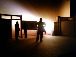 2013/11/13 今日は、午後6時の仕込みだ。僕は1時間の余裕をみて、歩き始めた。だいたい坂を登る感じだ。文化会館は、小山にあるから。 枯れ葉が舞う。 何度か来た会館で、歩いて行くのはめずらしい。 子どもの頃、今の時期に山に入り、学生服の両ポケットに、あけびや栗を一杯に採ったものだ。 僕は山が好きだった。毎日、木に登り、何かを空想した。 だけど、今こうして会館に向かって、明日の公演を準備する僕自身は、とてもとても想像出来なかった。 前政人 |