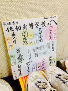2013/12/3 こんにちは、原田先輩役の中川です。本日の公演はふじみ野高等学校のみなさんです。 搬入口も舞台もかなり狭かったのですが、何とか無事に仕込みも終わり、さあ本番とその前に先生から生徒さんに注意事項を話していました。 袖で話を聞いていたのですが、アットホームな感じで先生と生徒さんが本当に仲がいいんだなと思いました。 開演前に校長先生から生徒さんは「とても元気のいい生徒ですよ。」と聞いていた通り本当に賑やかな公演となりました。 本日は満席で先生方は後ろの方で立って観ていらっしゃいました。 本当にお疲れ様です。 お芝居を楽しんでもらえていたら嬉しいです。 終演後に校長先生が楽屋まで来てくださり「とても良かった」と言っていただきホッとしました。 ふじみ野高等学校のみなさん本当にありがとうございました。 ![]() 今回は原田先輩特集01をお送りします。 原田先輩が使っている靴は他の生徒が履いている靴とは違い特別バージョンです!大分違うでしょ! ![]() 新しく買った靴を使用感を出すために惜しげも無く汚しています!渋い。 ![]() 実は前回の10月1日に一回原田先輩の靴下はアップされたのですが、今回は色違いです。前回はグレーでしたが、今回はレッド!実はまだ他の色があります。それは次の機会に…。 ![]() 本邦初公開!原田先輩のメガネです。レンズは外してあり完全に伊達眼鏡です。 本当は白っぽい色だったのですが、原田先輩のイメージに合わせて黄色い塗装をしています。結構凝ってるでしょ! 今回のスペシャルは以上です!またいつか02をやりますのでお楽しみに!その時は原田先輩Tシャツ特集をしたいと思います! 楽しみにしていてくださいね。 原田先輩(中川為久朗) |