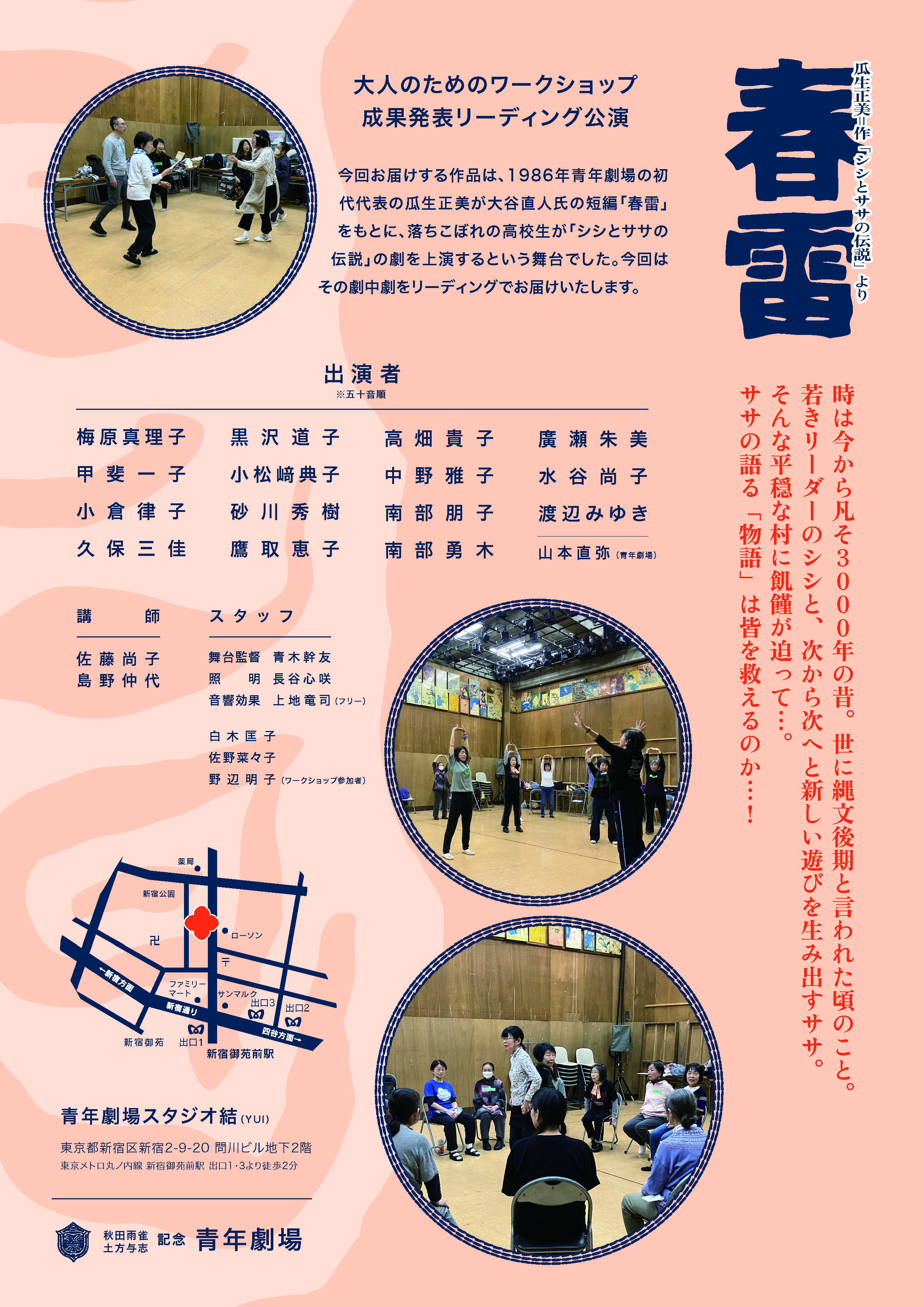 1986年、青年劇場初代代表・瓜生正美が書き下ろし、全国の高校を巡演した「シシとササの伝説」。作中で落ちこぼれの高校生が演じる劇中劇は大谷直人氏の短編小説「春雷」を基につくられました。今回はこの「春雷」をリーディング公演でお届けします。