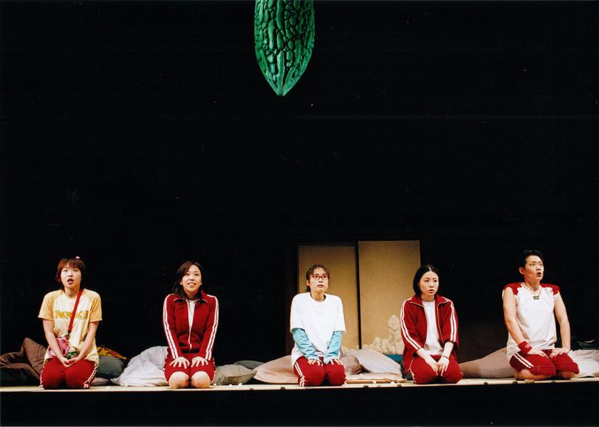 ごう 俳優さんたちに対しては、とにかく目線を下げないで同じ地平で役を考えていってほしいな、ということが大前提なので、とにかく真剣に同じ目線の中にある高校生ということを探求していってもらった上で、装置とか少しばかばかしくしておいて、あのゴーヤが下がっている下がっていないは賛否両論ありますが、ただ会場に入ってきた瞬間に「わ! ヘチマだぜ!」「イヤ、ゴーヤだよ!」とか言う時点で、「芸術鑑賞会」という名前で来ている子どもたちの背中が変わるんです、それこそ。そうなったときに、俳優さんには子どもを信じてやっていただくということですね。