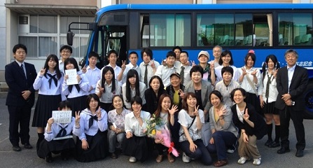 そして名残惜しい別れの時間。全てのセットをトラックに積み込み、みんながバスに乗り込むと、江村先生から、「本当にありがとうございました!私の芝居を観る目は間違っていなかったと確信しました!」と、嬉しいご挨拶を頂いた。バスが校門に向かう道々で生徒さんたちが大きく手を振って見送ってくれた。