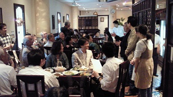 今回は“ベトナム料理”のお店にて美味しい料理を囲んでの会となりました。観劇直後とあって、早速感想タイムに。福島から駆けつけてくださった会員さんからは、原発事故による切迫した現状と舞台を重ね合わせての想いが語られました。また、いつもとはちょっと趣の異なる舞台の始まり方についての質問など、賑やかなトークとなりました。