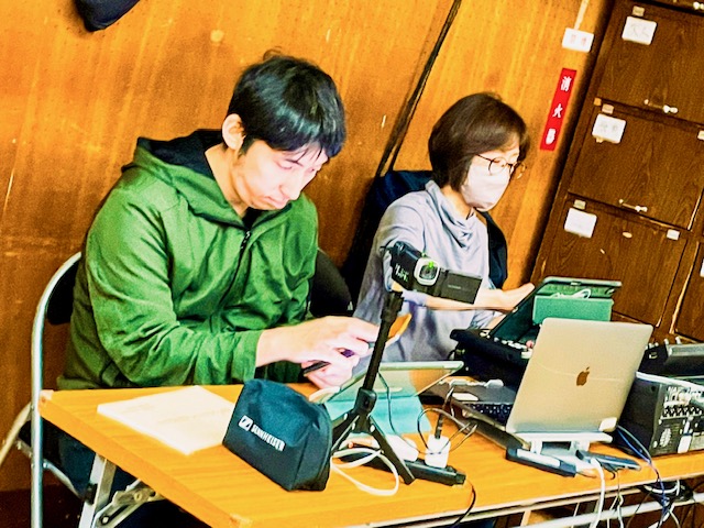 こちらは、俳優さんですが音響スキルもお持ちの傍島さん。プランナーの樋口さん、オペレーターの齋藤さんと仕込みをしてくれてます。