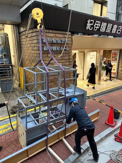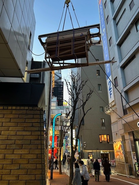 紀伊國屋ホールの方の技術で「行きたい~」班の大きな道具をクレーンで搬入して行きます。