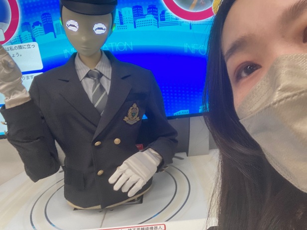 大江戸線新宿西口駅改札前の案内ロボットのアリサさん。記念写真のため様々なポーズをしてくれます。