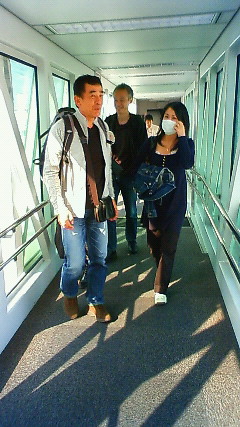 到着直後の杉本さん、暑さに驚き?機内は乾燥してるため、喉を保護する為にマスクも欠かせません゜。