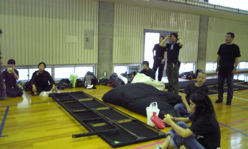 曇天時々激しい雨の中、鹿児島へ移動・そして二階の体育館での仕込み。