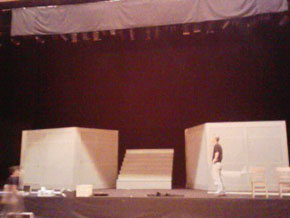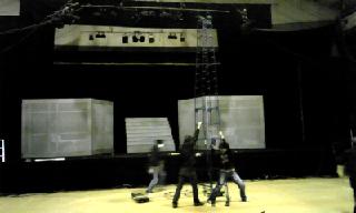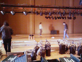 通常のホールと違って、何も無い空間を劇場に変えるのは決して楽な事ではありません。張り出し舞台を組み、天井からロープを垂らして照明機材やスピーカー、3150の最重要アイテムである雪崩の仕掛けを吊ったり、直接目に触れないところもアレやコレやとなかなか大変なのです。ですが生徒さん達が会場に入った瞬間の驚きや歓声が何よりも喜びなんですよ!と、みんなそれぞれ自分を励ましていると思います。多分。