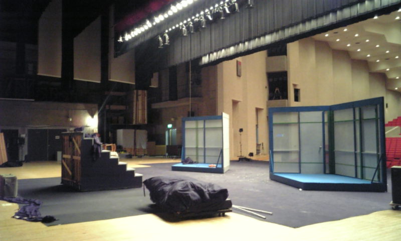 私の斜め前の前さんは、照明の仕込図書きのお仕事中。運輸部さんは今日も大活躍です。