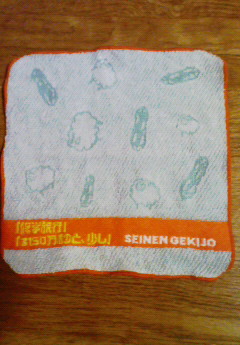 写真は、座談会終了後の記念撮影(たまたま通りかかった劇団員にも入ってもらった)とサポーターの皆さんへの記念品です。両公演名が入っているハンドタオルです。