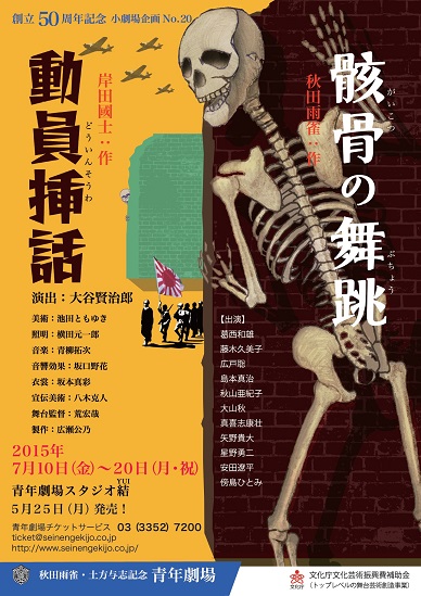 スタッフ 作=岸田國士(「動員挿話」)作=秋田雨雀(「骸骨の舞跳」) 演出=大谷賢治郎 美術=池田ともゆき 照明=横田元一郎 音楽=青柳拓次 音響効果=坂口野花 衣裳=坂本真彩 フィジカルトレーナー =原田亮 宣伝美術=八木克人 舞台監督=荒宏哉 製作=広瀬公乃 |