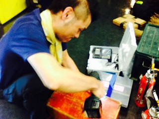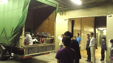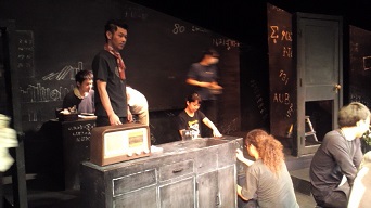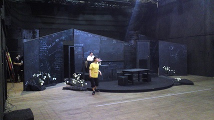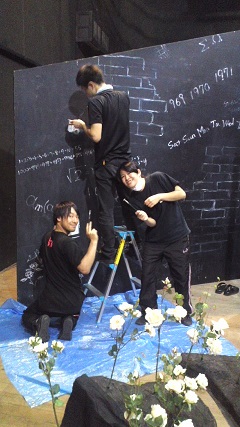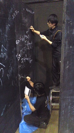 ![]() 荷積みの様子。今回のスタッフは新メンバーが多いです。 後ろ姿ばかりでスミマセン。 ![]() 今回東京演劇アンサンブルさんの稽古場をお借りしました。 長旅でかすれてしまったセットの数式たちをみんなで補修しました。 横矢くんと林田くん。