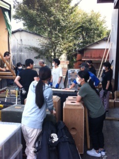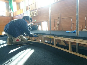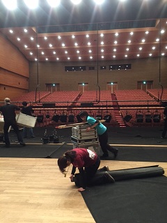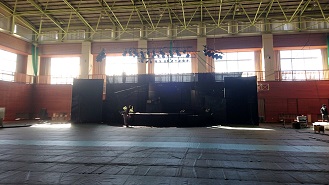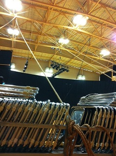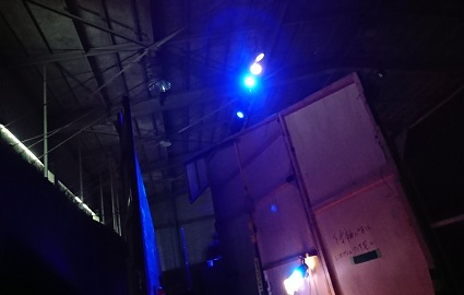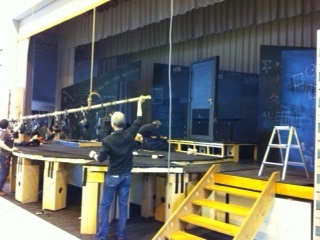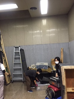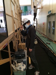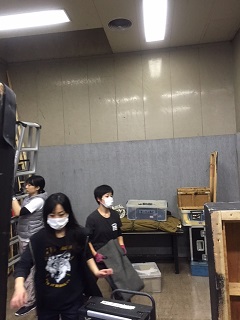![]() 一方、舞台側では基本台が建ち、小道具が箱から出され、照明を吊り上げる準備が進んでおります。