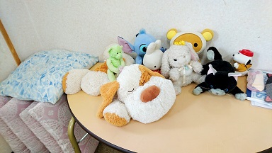 都賀中学校です。カラフルな博士ガールズ。 これを着てると、生徒さんから「可愛いー!」、「すごーい!」と声がかかります。 ![]() さあ!本日も寒さなんてなんてその…。…嘘です。しっかり防寒して仕込み開始です。 “博士の愛した数式”の舞台は体育館の床に組みます。普段は、体育館を横使い(?)にして舞台を組みますが、今日は縦使い。体育館のステージと向かい合うように組みます。 ![]() そうそう。今日は、仕込みに小さなお客様がいらっしゃいました。 カタツムリです。小道具にくっついていたとのこと。…えっ!?いつくっついたの!!? 舞台を見たいのかなー?でも、ごめんよ。ここじゃ君は生きづらい…。石井さんとともに、そっと校内の湿り気のある土と樹木の元へ帰しました。 元気に生きろ〜。 ![]() ところ変わって楽屋です。本日はカウンセリングルーム。 可愛いぬいぐるみに日向ぼっこできる窓際の絨毯。おや、先に休憩していらっしゃる方がおりました。飲み物片手に、休憩も必要です。