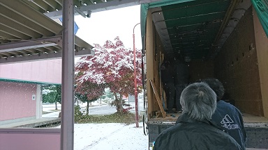 トラックへの積み込み。 入れる順番がきちんと決まっていて隙間なく荷物が入っていきます。
