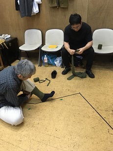 2019/8/15 今日は終戦記念日だ。我々は稽古だが、品川のスポーツ公園では毎年の終戦記念日に因んだ平和を込めた新劇人の野球大会が行われている。 ![]() 「もう一人のヒト」の稽古場では若い俳優たちにゲートルが渡された。芝居は昭和19年〜21年までの話、当然ゲートルも衣裳として出て来る。 今、劇団でもゲートルの巻き方を伝えられる先輩が段々少なくなって来て、「青春の砦」という作品を経験した者は何とか巻けるのだが、今日は若い俳優たちも当然分からずに何人かの経験者に教えて貰っていた。本当はこんなもの知らない世の中が良いんだけどね、我々は伝える職業なのでこの先後輩たちに伝えて行こうと思います。 杉本純一郎役 島本真治 |