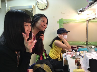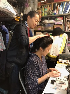 本日、初めて衣裳をつけての通し稽古をしました。やはり衣裳をつけるとグッと世界観が広がります。 衣裳をつけるにあたり髪形もセット。 あたくし、福竜こと広橋デンは、今回衣裳を担当している浦吉ゆか先輩に髪結いから衣裳の介添えまで、たくさんたくさん助けていただいております。感謝! そして、ゆかさんが作ったあの衣裳がすごいんです!!大いに衣裳もお楽しみいただけますよ。ご期待くださいね。 稽古場での稽古は後2日、更なる向上を目指し頑張っていきたいと思います! 中山万紀 |