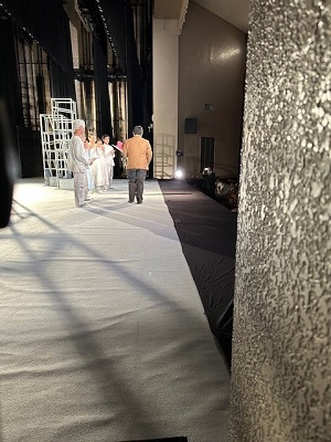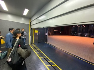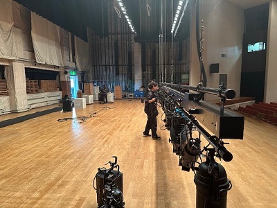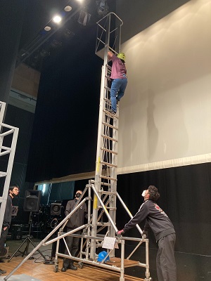 本日は照明の当たり(照明の当たる場所を決めていく作業…で合ってる?ごめんなさい、語彙力がありません)をこちらのタワーを使って行います。登っているのは照明プランナーの松浦さん。かっちょいいッス!