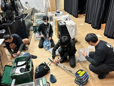 さ、仕込みますよ。我らが舞台監督・青木さんは今日も全身で体育館のステージと会話するように設営します。