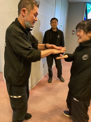 ウォーミングアップで台詞を言いながら相手の手を叩くゲームをしている奥原さんと竹森さん。中々の心理戦です。どんな状況でも台詞を言えるように訓練しています。