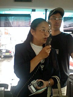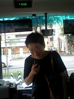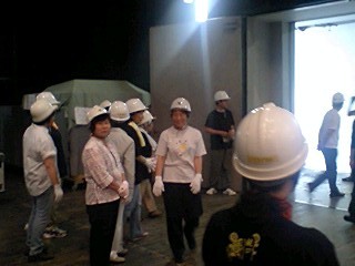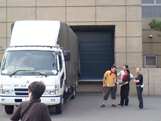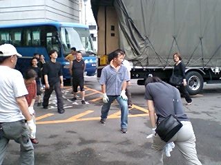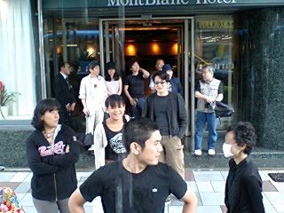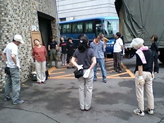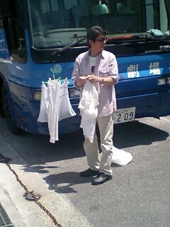 皆様お変わりございませんでしょうか?「銃口―教師・北森竜太の青春」公演班は7月12日朝、大垣市から名古屋市へ移動。名古屋市民会館にて名古屋演劇鑑賞会(以降、名演)、12日ヨル、13日ヒル・ヨルの3ステージの公演でした。折しも台風4号が接近、朝から横殴りの雨でずぶ濡れで出発した公演班一同、ゲンナリ・・・。スナップでは判りにくいかも知れませんが、バスの乗降口が「滝」のようになっていて、必ず濡れてしまう仕掛けになっているのです!