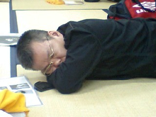 初日のヨルの交流会には、今旅初めて筆者も参加。会員さんの暖かい反応に感激しました。会の締めには「恒例の(?)」エールの交換もやらせていただき、盛況でした。それにしても、やはり2ステージは疲れます。我らが吉村 直の健やかな寝顔からお察しいただければ幸いです。二回に渡っての名演報告にお付き合い下さり、ありがとうございました。