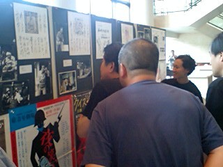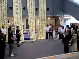 皆様お変わりございませんでしょうか?「銃口〜教師北森竜太の青春」公演班は7月28日、魚津市から高岡市へ移動。高岡演劇鑑賞会の公演を、高岡文化ホールにて28日ヨル、29日ヒルの2ステージで行いました。劇団と高岡演鑑との関係は、古くは1968年(まだ生まれてなーい!という劇団員多数)の「オホーツクの女」から始まっており、我々が会場に到着するやいなや「お久しぶりです!」の声が、あちらこちらで聞かれました。ロビーには、出会いのきっかけとなった「オホーツクの女」以降の、高岡演鑑での青年劇場全上演作品のポスターと色紙が展示され、さながら「ミニ青年劇場博物館」!大先輩達の若き勇姿に、一同大盛り上がりでした。