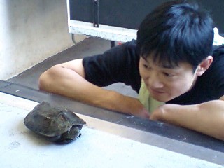 御存知の方も多いと思いますが、魚津市は「蜃気楼の街」として有名です!ちなみに我らが千賀さんは「蜃気楼って、道の先がモヤモヤしてる奴だろ?」「それは、陽炎!」と突っ込まれ、島田さんは「アー、ここで見るオーロラは綺麗だろうなぁ!!」「北欧じゃなく北陸ですから、ここは・・・」と、かなりトホホな会話の連発でした。それはさて置き、晴天にも恵まれた公演班は、各々自然を満喫!今回は、近くの小川で捕まえた草亀と戯れる船津君にスポットを当ててみました。