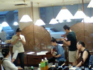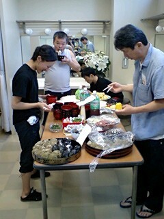 さて、「銃口」の公演は、初日から大変御好評をいただき、大成功の3ステージとなりました!二日目の昼の公演の後には、会員さん手作りの心のこもった「お通し」に一同感激、感嘆、満腹!なかでも、「ツタンカーメンの豆ご飯」(詳細を知りたい方はお尋ね下さい)は、お代わりが続出しておりました。朝移動〜仕込み〜公演〜撤収の続く忙しいコースですが、会員さんの暖かい反応をバネに、ツアーを続けていきます!