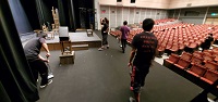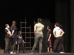 こんにちは!「きみはいくさに征ったけれど」班、舞台監督の安田遼平です。 今日は旭丘高校さんの体育館での仕込みです! 正式に舞台監督になって初めての体育館公演、実は結構緊張します。。 とはいえやるのはいつもの体育館公演と同じです。 今日は2階の体育館なので搬入が少し大変ですが、全員の力で無事終わりました。 照明を吊るための、ロープを通すための長い竹竿も久しぶりの出番です! 体育館のステージの上にスノコと呼んでる場所があります。 そこからもロープを通して照明機材などを吊るのですが、 普段学校さんは使ってない場所なのでホコリがいっぱい。。