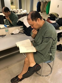 いただいた先生方にも心から感謝いたします。ありがとうございました。 こちらは本番前に公演を成功させる為に 最後まで台本に向き合っている泰三役の高山くんです。 お疲れ様でした。