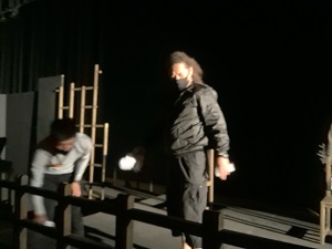 2020/11/25 朝から久びさの雨、肌寒さがいよいよ冬の到来を告げます。さあ!東海大学付属相模高等学校さんとの出会いです。 先日は竹内浩三役の私矢野と制作の松永さんとで学校にお邪魔して、 観劇前に作品をより理解してもらおうとインタビュー形式での事前学習をしてきました。 コロナ対策で面と向かっては出来ませんので各教室オンラインで観てもらいました。 が、緊張して早口にもなったし上手くいったかな〜。 ここで開場10分前、スタッフさんによる舞台セットへの「アルコール噴射除菌ターイム!ライトアーップ!」