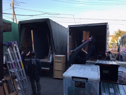 2020/12/7 こんにちは!「きみはいくさに征ったけれど」班、舞台監督の安田遼平です。 今日は残り2会場、ステージにむけて荷積みです! 九州や、知多、関東を経てラスト2会場は少し特殊なので トラックを変えたり積む物を変えたりスペシャルです。 左側のいつも使っている劇団のトラックから、 右側のレンタカーのトラックへ積み替え。 ひとまず全部の荷物を出したりもするので倉庫の中もごちゃごちゃしてます(笑)