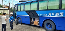 本番中は、集中して観ている生徒さん達の後ろから舞台を見て明かりを変化させます。 トラックに道具、機材積み込みまで安全第一です。 青年劇場 松浦 みどり |