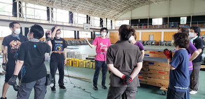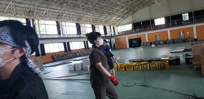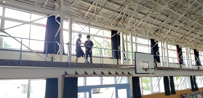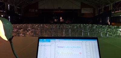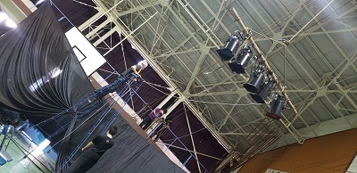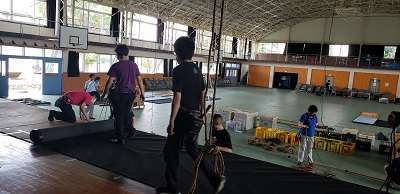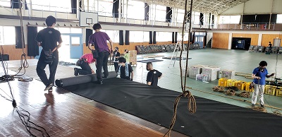 今回は学校公演です。 張り出しありの体育館、 久しぶりの仕込みに汗をだらだら流しながら仕込んでいきます。