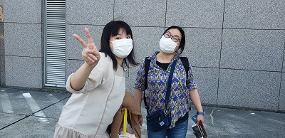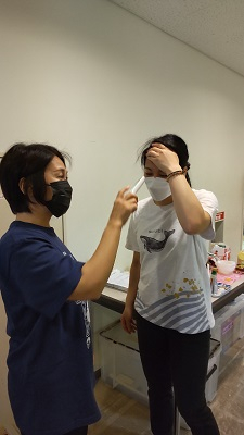 マスクでほとんど顔がわかりませんが、 9月公演「豚と真珠湾」に出演しますので、ぜひ舞台でご覧ください! 彼は、少し前まで新劇交流プロジュクト 「美しきものの伝説」にスタッフとして参加していたので 他の新入団者より少し遅れての公演班実習です。 すんごく一生懸命働いてくれましたよ。頼もしいです。 芝居にもとても心動かされたようでした。 そして、泣く子も黙る?普及者・江原朱美さん。 この人、カメラ向けると必ずピースするんです…。