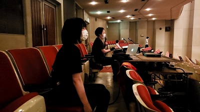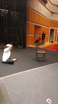 さて、今日ご紹介するのは2人の新入団者です。舞台上でお掃除してくれているのは、 去年1年間の学生アルバイトを経て、 新卒で製作部に入団してくれた佐野菜々子さん。 この3日間、研修で公演班に同行してくれました。 慣れない肉体労働で、ちょっと筋肉痛らしいです。 研修最終日の今日、高崎北高校の生徒さんと一緒に観た舞台で、 なぜか号泣しちゃったんだって。 うるうるしながら楽屋に戻ってきて 「いつも感動してるんですけど、こんなにずっと泣いてたの初めて」 さらに帰りの電車の中で「生徒さんが凄く集中してて、その空気も含めて感動したんだと思う」と。 ステキな製作者になれそうだ。 そして、もう一人、こちらは音響効果部の専門として入団した海老原由乃さん。 ベテランの山口ゆりさんの隣で勉強中です。 カメラを向けると「みかさん、かわいく撮って下さいね」とピースするたくましさ。 すでに馴染んでます。