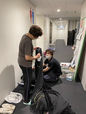 楽屋の廊下で島野さん(左)と林田くん(右)が何やら話し合っています。 どうやら破れてしまった袖幕を直す算段をしているみたいですね。