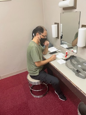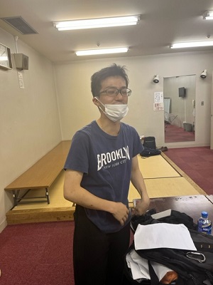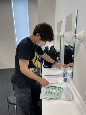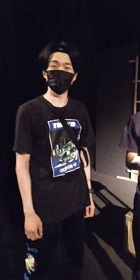 2022/7/11 2度目の登場、伊勢のおばちゃんこと福原美佳です。今日は、練馬文化センターにて 都立光丘高校の生徒さんたちに観てもらいました。 久し振りに東京都区内での公演とあって、 劇団関係者がたくさん訪れました。 まずはこの人、今年入団した山本直弥君。