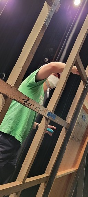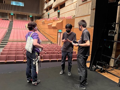 2022/6/24 6/24は逗子文化プラザ、逗子開成高校の公演。出演者の高山さんと中川さんにも 照明の作業を手伝ってもらっています。 照明スポットを舞台に向ける為に高所に 行くのでヘルメットとフルハーネスという 建築現場などで使う安全帯をつけて作業します。
