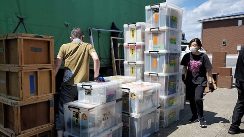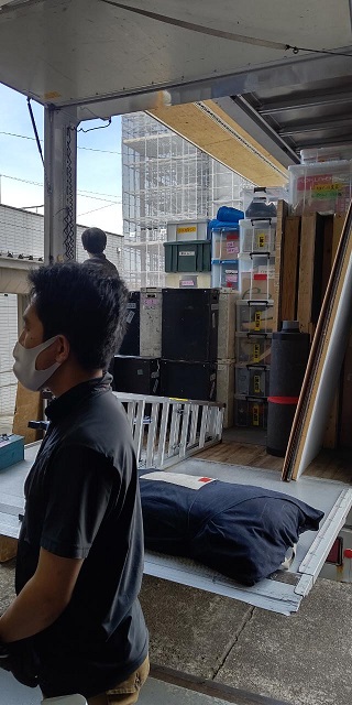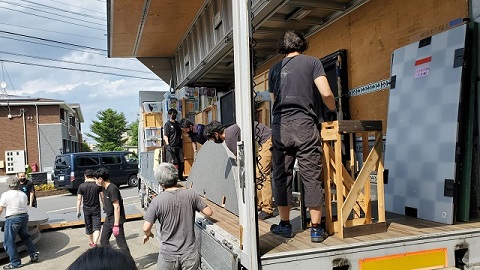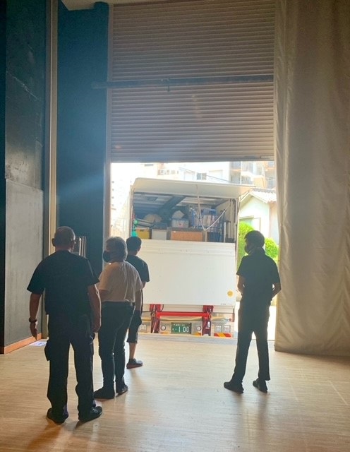 ![]() 本日は、今回の公演の為に劇団の倉庫で、トラックへの荷積みでした。 11トントラック満載に、公演に必要なものを積んで行きます。